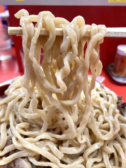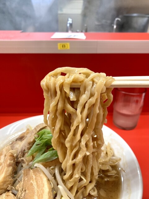 麺は太めのちぢれ麺で、二郎系にしてはそこまで太くないので思いっきり啜るも良し!口の中で噛みながら味わうのも良しなイケ麺です