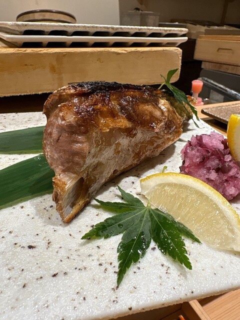マグロのトロ先ヒレの焼物。脂がのっていて濃厚。ポン酢や柴漬けを刻んだ大根おろしでさっぱりと。