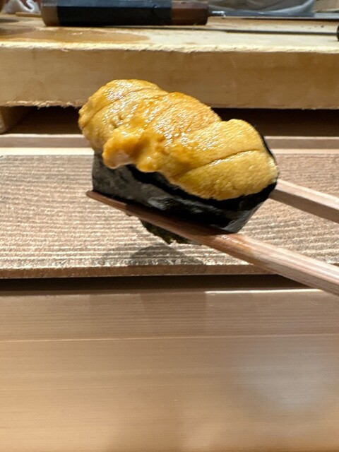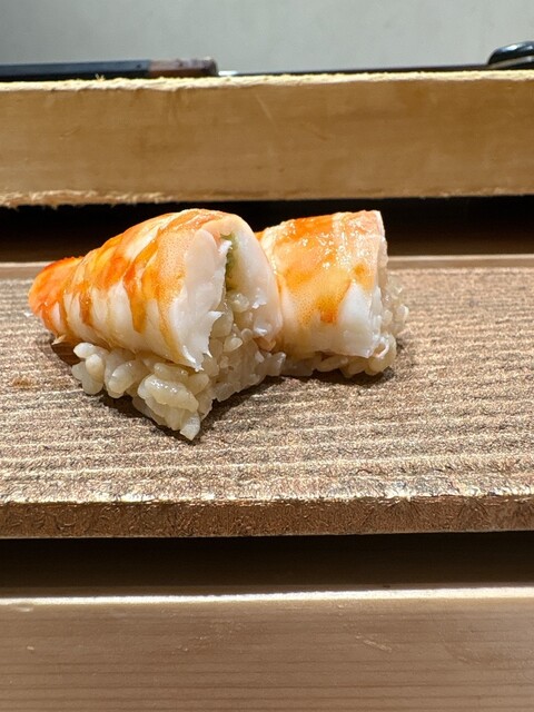 山形県産マグロの漬け、背トロ、熊本県産の小肌、沖縄県産の白足海老、北海道礼文島産の雲丹、いくらの手巻き。マグロの漬けは旨味がしっかり引き出され、背トロは口の中でとろける濃厚な甘み。小肌は酢の締まり具合が絶妙で、白足海老は厚みがありぷりぷり。雲丹は濃厚クリーミー、いくらの手巻きは粒が弾ける贅沢な一品。