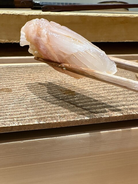 淡路産のスミイカ、長崎県産の尾長鯛の昆布じめ、高知県産の縞鯵。スミイカは塩でシンプルに。尾長鯛は柔らかで上品、昆布の風味がほのかに香る。縞鯵は脂がのり身がぷりぷり。
