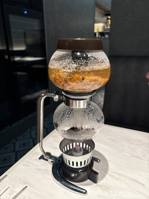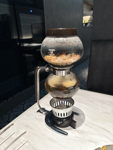 テーブルでサイフォンを使って鰹節と昆布の出汁をとる演出が見事。抹茶椀に盛られたイチボと野菜に出汁をかけ、まずは鬼おろしとともに。濃厚な出汁の旨味を感じた後、お椀に残った出汁をそのままいただいて二度楽しめる。