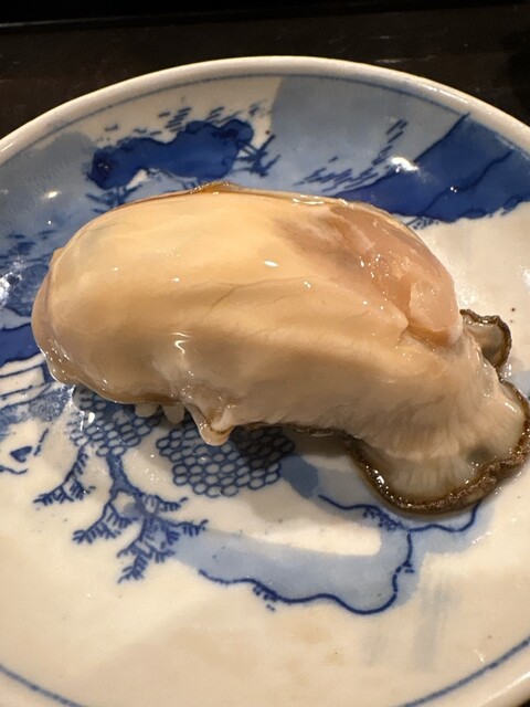 旬の牡蠣。大ぶりで、シャリの上にどんと乗る贅沢仕様。生牡蠣を鮨ネタに使う大胆さが光る。
