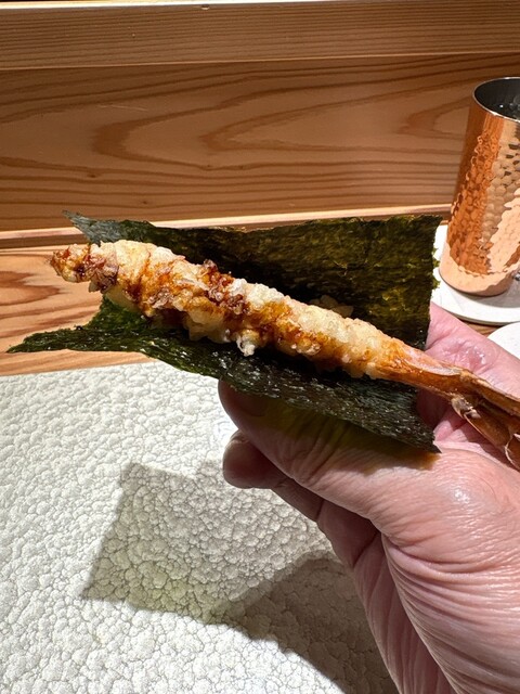 揚げたての海老天は熱々でぷりぷり。シャリと海苔との一体感も良い。