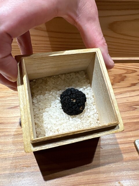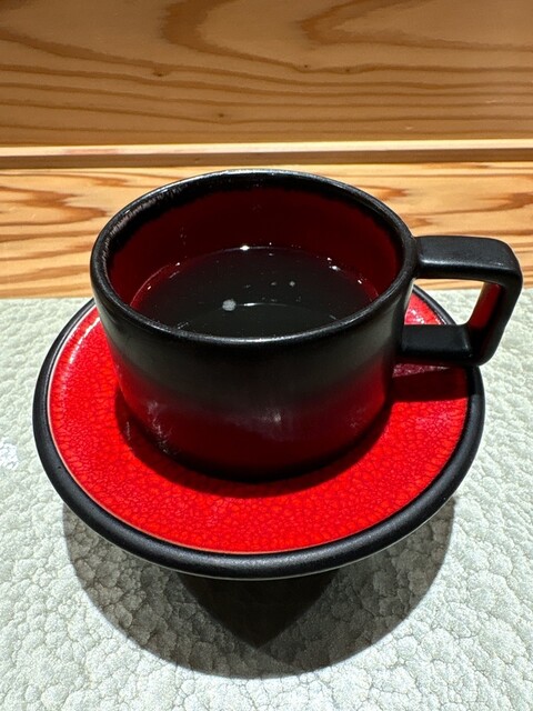 エスプレッソに見立てた、あさりベースの出汁。カツオを合わせ、竹炭で色付け。濃厚な出汁が胃に染み渡る。