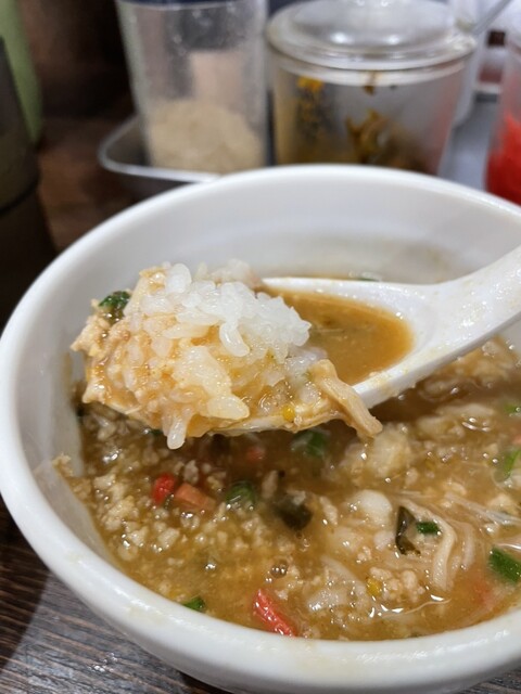 ご飯をスープにつけてスープカレーのようにして食べます。これが旨い!