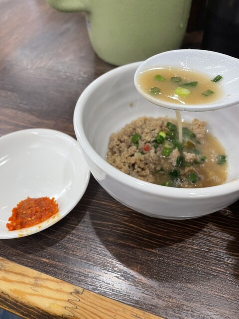 スープを魚そぼろ(魚粉入り)に入れてつけ汁を作ったら替え玉(ハリガネ)をお願いします。らーめんの次は魚そぼろスープにつけ麺でいただきます。魚介の味が加わり深みと旨みが増したスープが違ったらーめんとして楽しめます。唐辛子ペーストの辛味が良いアクセントです。