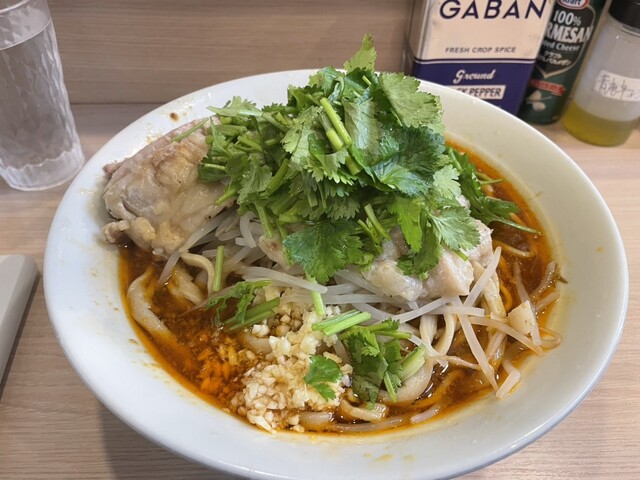 日テレの動く!IPS心臓展をの入場券をゲットした後の待ち時間を利用してこちらのお店に訪問。えどもんとさんの裏手にあるお店で新橋駅から5分ほどです!入口に助手(奥さん?)さんが案内や注文の確認をしてくれます。食券を先に買う(現金のみ)と麺量確認されるので450gでお願いします!外待ちは3人道路を挟んで駐車場側に並びます!15分ほどで入店です!店内はカウンター5席、卓上調味料はコショウ・お酢・一味のほかに粉チーズ・青唐辛子油・タバスコ(赤・青)といった珍しいものもあります。お冷は用意してくれます。紙エプロンは分かりませんでした。着席するとトッピングの確認があるので、ヤサイ・ニンニク・アブラ・花椒に有料のパクチー(現金渡し)をお願いします。5分ほどで提供です!