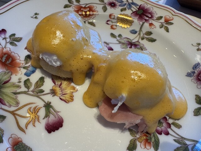 メインの エッグベネディクト は、ナイフを入れると黄身が♡ 濃厚なオランデーズソースが絶妙で、ふわふわのイングリッシュマフィンとの相性も最高! 一口食べるたびに幸せが広がる♪