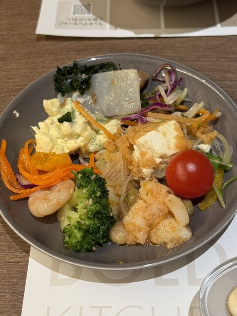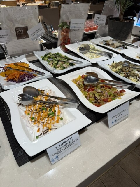 中央 魚介とお米のサラダちらし寿司見立て 右 鶏肉と冬野菜の芝麻醤ソース和え