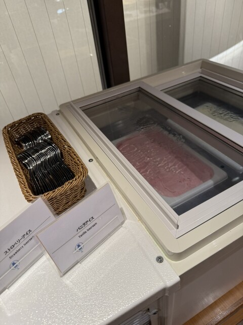 アイス ストロベリー バニラ 右にクリームソーダ用のグラスとさくらんぼが置いてある(昭和レトロ⁈)
