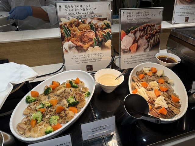 左 鶏もも肉のローストヴェルモット香るソース 右 豚ロース肉のブレゼ果実入りシードルのソースで