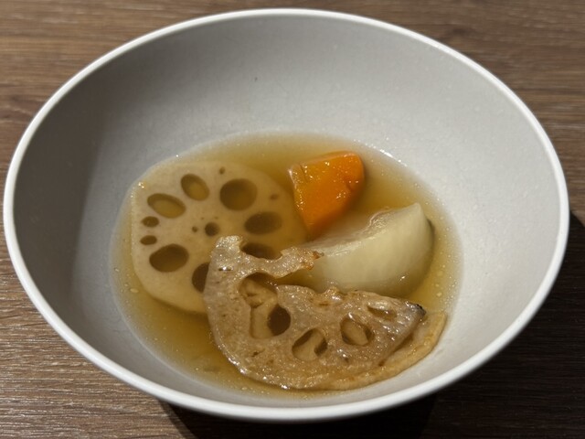 左 千葉県産蓮根のフリット 右 冬野菜のミジョテ(フランスの煮込み料理)