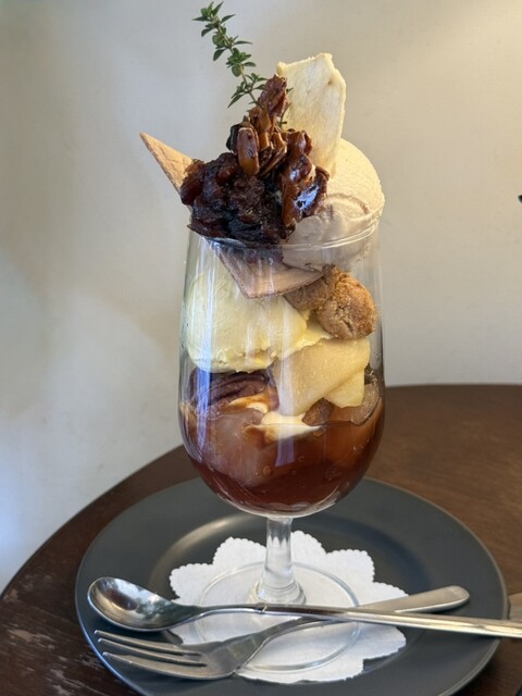 パフェは、先ず上の方にあるリンゴタタンの甘さが美味しく、塩キャラメルとさつまいもの2種類のアイスが入っていて、嬉しい美味しさです
