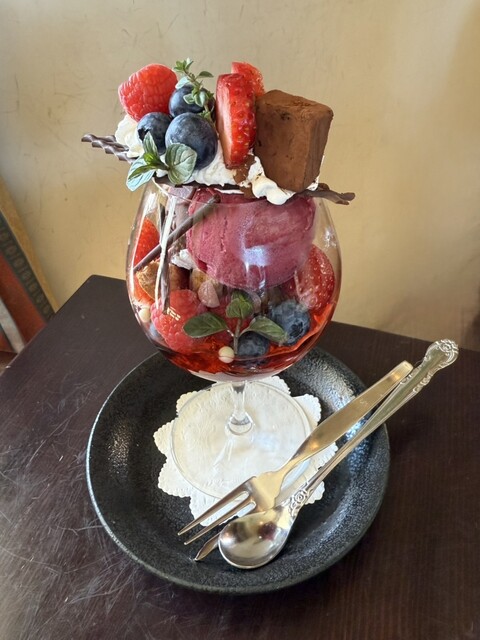 こちらのパフェ、いろいろな物が入っていて作るのに時間がかかる筈です