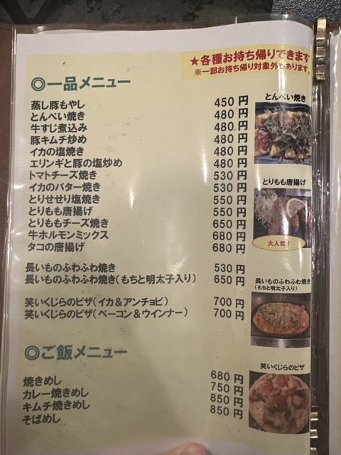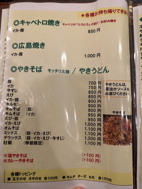阪急で行く人は、上新庄駅の北口側から降りた方が近いかな?営業時間2025.07時点ですが17:00〜23:00(定休日は月曜日となってます)店内はカウンターとテーブルがありテイクアウトでお持ち帰りもできます(一部はお持ち帰りはできません)ここのお好み焼きが好きで父と来てました。父のオススメはトッピングでキムチを加えることがオススメだそうです。メニューが更新されてない様子だったので私のためにもメモとして置いておきます(^^)