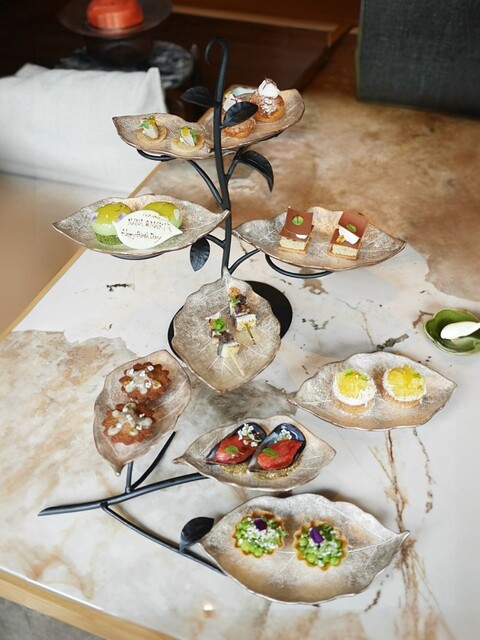 特に心惹かれたのは木の枝のようなツリー型のティースタンドや器など。それぞれ葉っぱのお皿に飾られたメニューが可愛くてとても好みでした。