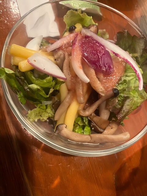マカロニ、サニーレタス、アカタマ、しめじが入っており、おそらく多少のカレーを効かせており風味良いドレッシングとして爽やかに食べられます。