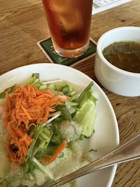 ドリンクに加えて、サラダとスープが付いてきて、更にサイドメニューが選択可能(今回はコールスローを選択)