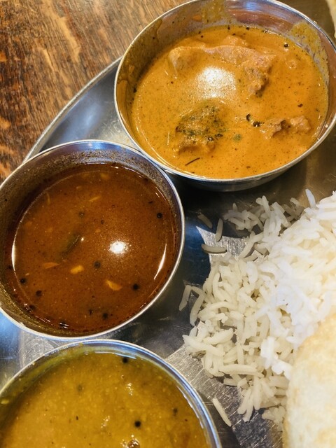 平日ランチに。ピークタイム後の13時半頃だったので、店内は落ち着いた雰囲気でした。ランチミールスをオーダー。3種類の日替わりカレーとサンバル、ラッサム、バトゥーラ、バスマティライス、パパドとサラダ。この日のカレーは、小海老と魚、ピーナッツチキン、ベジタブルでした。小海老カレーは旨みと酸味と辛味で締まりのある味。チキンは、ピーナッツの風味がよい、まろやかなカレー。いつもながらどれも全部おいしい!揚げたて熱々ふんわりのバトゥーラにつけて食べたり、ライスにかけて混ぜて食べたり、いろいろ楽しみながら完食しました。食後のチャイも追加。泡々でスパイスが優しく香る上品なチャイです。