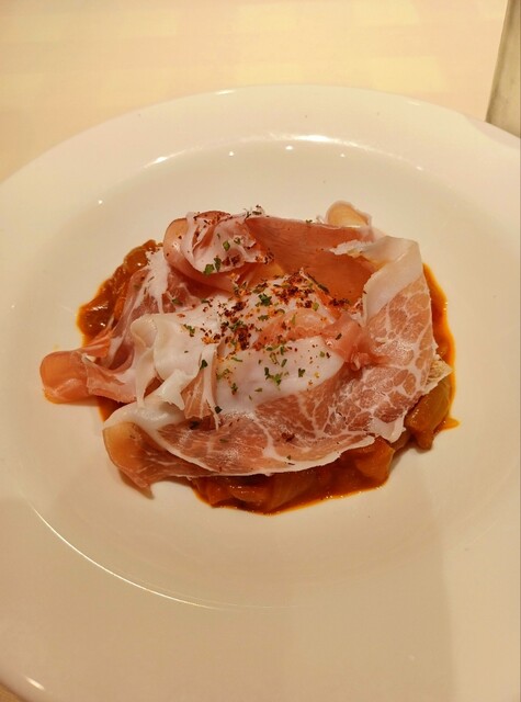 ○前菜 ラタトゥイユと生ハム、温泉卵