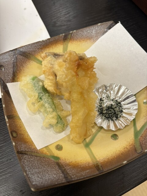 海鮮茶碗蒸し のどぐろ塩焼き 地魚とキノコの天麩羅を頂きました。特にイカの刺身と、のどぐろ塩焼きが美味しかったです。ご飯や味噌汁、コーヒー