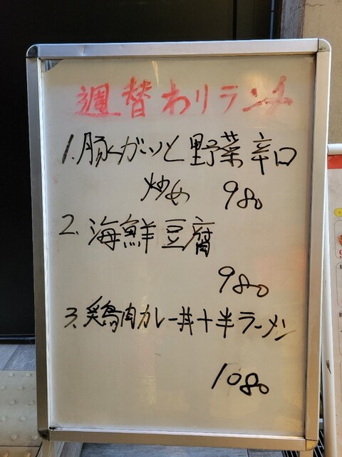ランチメニューは、週替わりか豚ガツ野菜辛口炒め定食と海鮮豆腐定食が980円、豚肉カレー丼+半ラーメン定食が1080 円。他に定番のランチメニューで餃子定食900円や餃子ラーメン定食980円、レバニラ定食900円や麻婆豆腐定食900円など豊富なメニューがあります。エビチリ定食1080 円って安いとは思ったのですが、今日は餃子目当てなので、注文は餃子定食です。