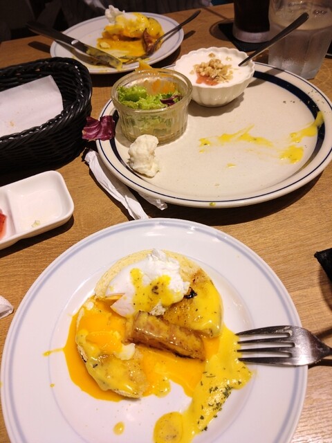 ここのエッグベネディクトも食べてみたかったので、10時半に予約して、モーニングの時間帯にエッグベネディクトとモーニングのトーストを注文し、11時になったらランチのパスタを注文し、12時過ぎたら桃のパフェを注文するという、ハードスケジュールで挑んだ(笑)