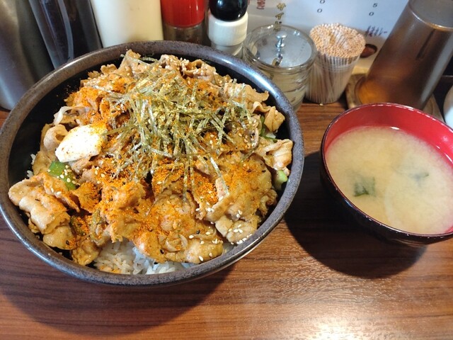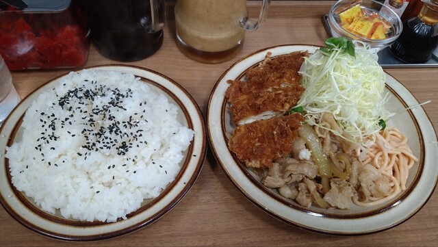 ちょっと甘めの生姜焼に揚げ物をトッピングしていただくスタイル。