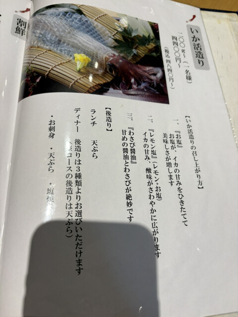 メニューはコースかアラカルトで今回はアラカルトで好きな料理を頼みました。メインのイカは呼子で水揚げされないとイカ刺しが食べれないので事前に確認したほうが良いですね。