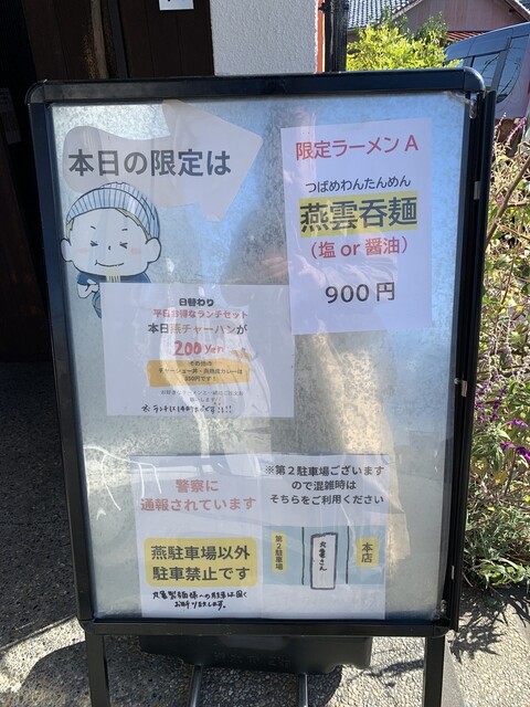 限定は燕雲吞麺かぁ。あとはセットメニューで好きなラーメンと燕チャーハンが200円!
