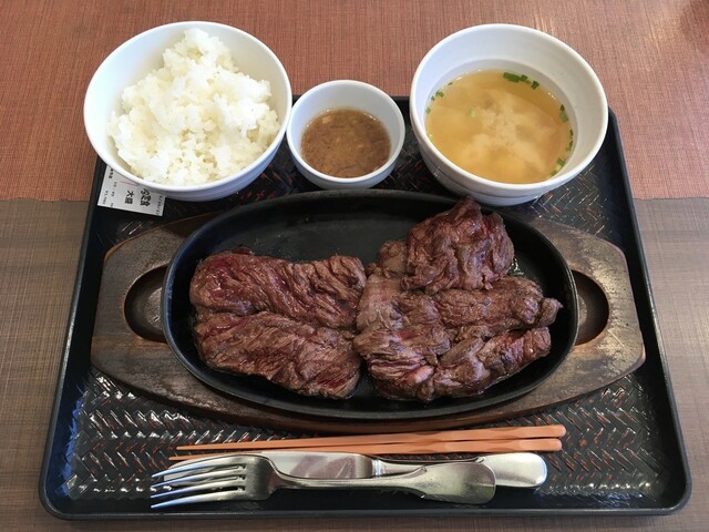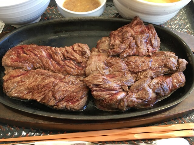 10分程で「出来ましたよコール」が鳴って受け取りに。ジュウジュウ鉄板に大振りの厚切りお肉が2つ。ご飯はもちろん大盛りです。ナイフとフォークにお箸も付いていたので、まずはお肉を適当にカットして、付け合せのステーキソースにダイブさせて実食!クチ一杯に迸る肉汁と弾力。お肉の部位はモモでしょうか、少し固めで歯ごたえがあります。その分、肉々しステーキを食べてるぞ』感がマシマシです。ふたクチ目からは何も付けずにお肉だけで戴いても充分に美味しく、おなかいっぱいになりました。またチャンスがあれば食べてみたいと思います。なんせ限定10食ですから。ホントは20食くらいあるカモ笑。今日も美味しく戴きました、ご馳走様でした!