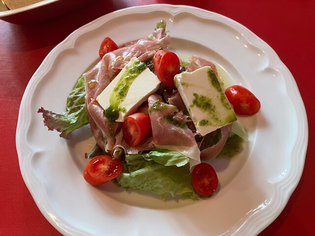 生ハムの塩気とクリームチーズのまろやかさを、サンマルツァーノトマトの優しい酸味が上品にまとめバジルドレッシングでとても美味しかったです。