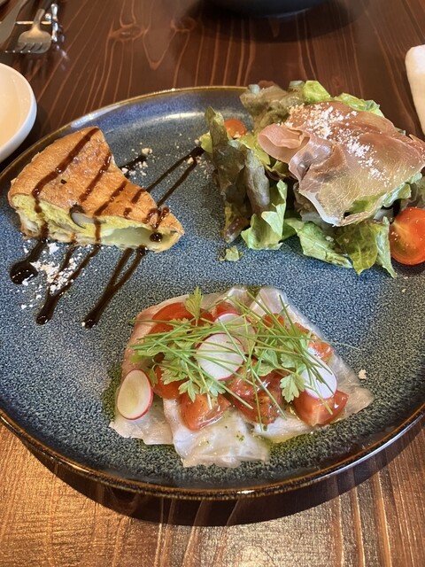 前菜盛り合わせは、生ハムサラダ、温かいキノコのキッシュ、カジキマグロのカルパッチョと、どれも美味しく、プラス料金以上の満足感がありました。