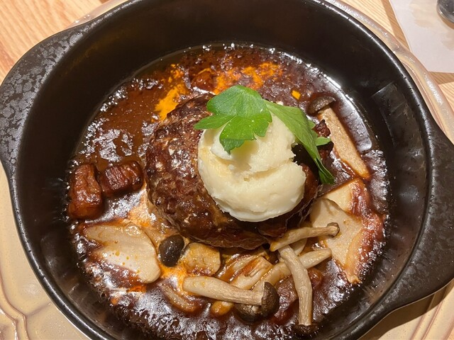 肉汁じゅわ〜の100%ビーフハンバーグを、上のマッシュポテトがまろやかに包んでくれて、コク深いデミ(シチュー)ソースが追い打ち、まさに王道の満足感がしっかりあります。