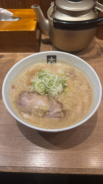 豚骨と鶏ガラの清湯にたっぷりの野菜と味噌を合わせた濃厚スープ。おろし生姜とニンニクがしっかり効いており、味噌の重厚さにキレと香ばしさをプラスしている。