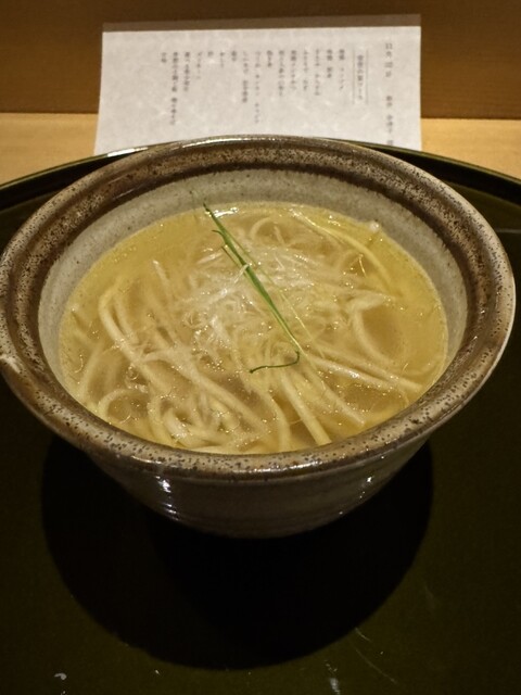 二日間かけて仕込んだ濃厚スープをワイングラスで。香りが立ち上がり、一口目から至福。