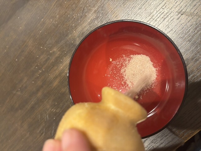 モナカの中に粉末のあんこが入っていて、器に粉を入れてから、モナカを崩し、お湯を注ぐとおしるこが完成。お湯をかけた瞬間に、モナカの香ばしい香りが広がり、とてもらおいしくて、手軽に楽しめます。わたしはお湯を少なめにして、濃いめで食べるのが好みです。