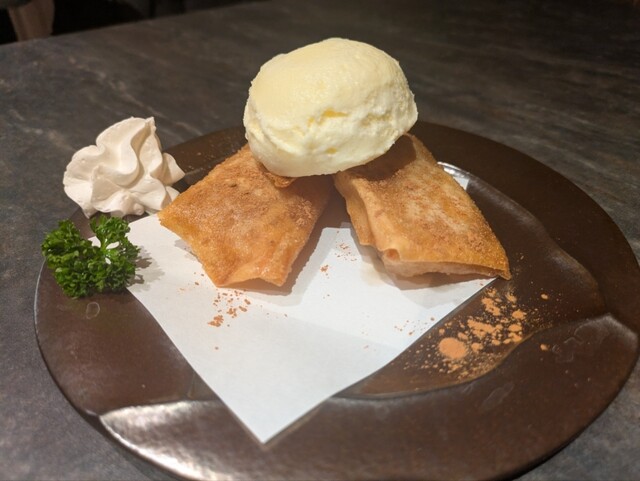 お腹いっぱいでしたが別腹でこちらも美味しくいただきました。アップルパイの具を春巻きの皮で揚げたもの。シナモンが効いててバニラアイスと一緒に食べることで更に美味しさ倍増しました。