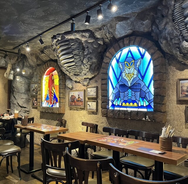怪獣のステンドグラスやオブジェがよくできていて、ちょっとした屋内アミューズメントという感じです。