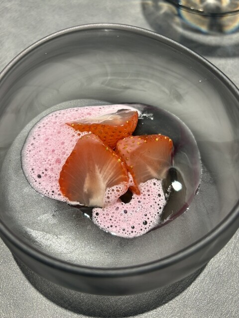 梅も味噌も苦手寄りで、料理全体でも塩味・苦味が強く、正直苦手な味でした。しかし、圧倒的な独創性で全てひっくり返ります。苺をこのような1%も想像できない味の仕上がりになっている。その感動を噛み締めて食べ進めていくと、次第に苦手な味かどうかさえ気にならなくなりました。