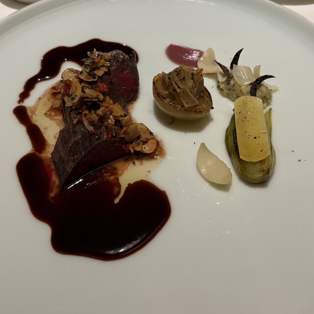肉料理嫌い(特にジビエ)な自分でも、これは素晴らしかったと言わざるを得ません。アーモンドと鹿肉の相性、ソースの風味は勿論のこと、付け合わせの野菜の味付けが凄く好みでした。メインの肉料理でここまで美味しかったのは人生初めてです。