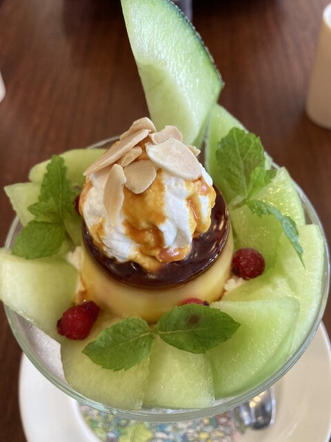 昔ながらのプリンをメロンで囲みバニラアイス、ホイップクリームを合わせたパフェ。