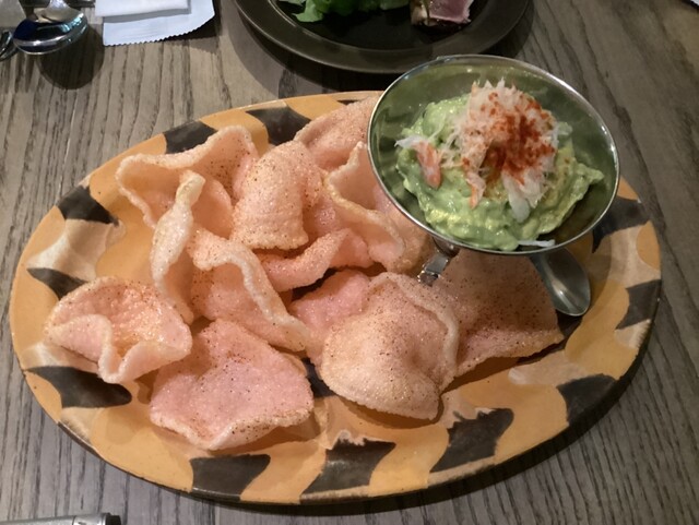 「ズワイ蟹とアボガドのワカモレ」(メキシコ料理のアボガドのディップ 揚げたてのえびせんにのせて)