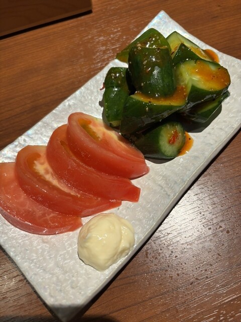 冷やしトマト、きゅうりの浅漬けに辛いソースが箸休め