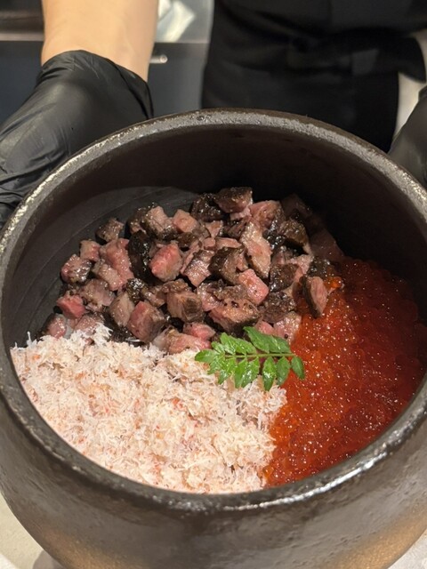 土鍋ごはんに和牛・蟹・いくらをのせて仕上げる贅沢感も格別で、最後はさっぱりとした自家製チーズケーキで余韻を残す。
