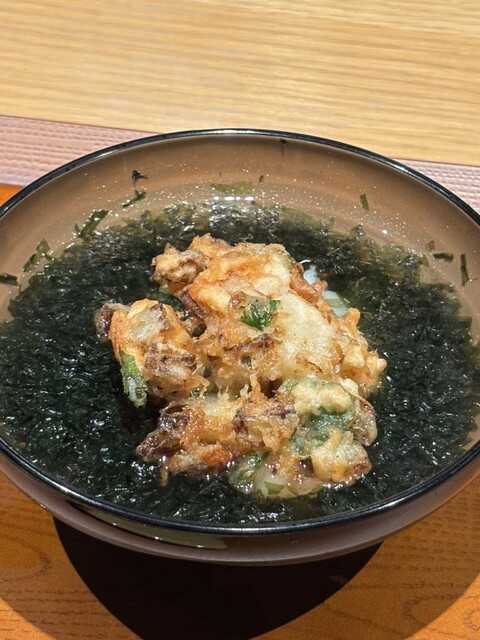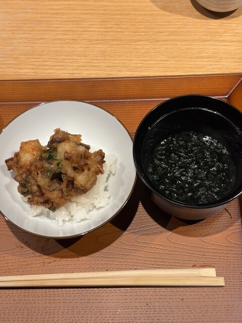 締めのかき揚げは、エビと桜エビがたっぷりで、出汁を吸った味わいが秀逸。