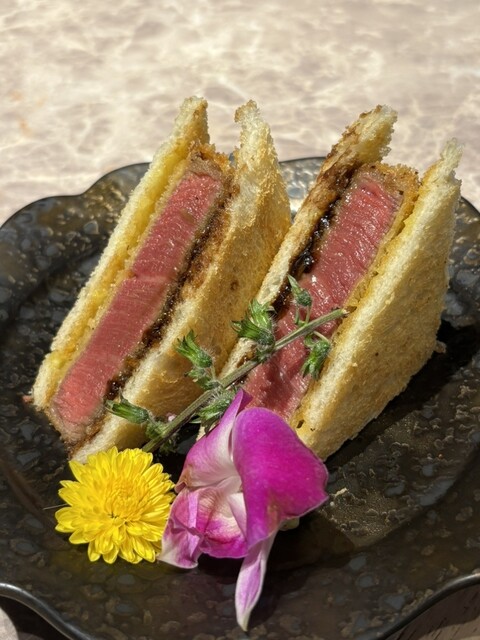 クライマックスは名物・ヒレカツサンド。厚切りヒレの存在感、サクッとした衣、ジューシーな肉質。締めとして申し分ない一品だ。