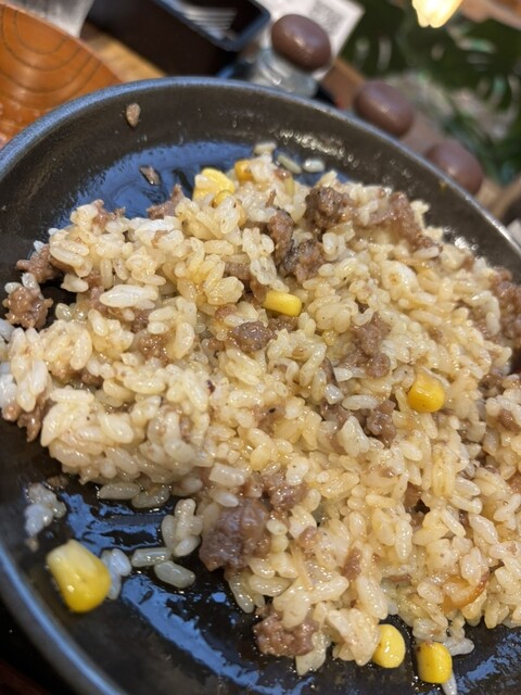 〆にガーリックライス。ハンバーグを一切れ残してライスと混ぜ混ぜ。付け合せの野菜も一緒に!味付けはガーリックソルトとごち玉ソース。とても美味しかったです。