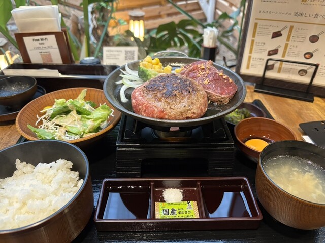 早い時間に来たので、スムーズに着席。初めての来店なので定員さんからメニューの案内もしていただきました。数量限定と悩みましたが、定員さんオススメのハンバーグとハラミステーキ御膳に決定!SNSからのごち玉ソースなるトッピングも無料で頂きました。しかもここはライスとスープがおかわり無料。このご時世でとてもありがたい。