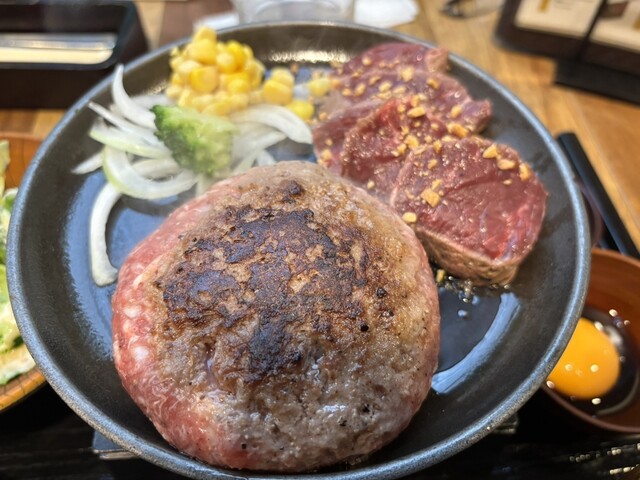 1口目のハンバーグはレア感がタップリで噂通りのとろけるハンバーグ。時間が進むにつれて食感の違うハンバーグが楽しめます。ハラミも美味しく頂きました。